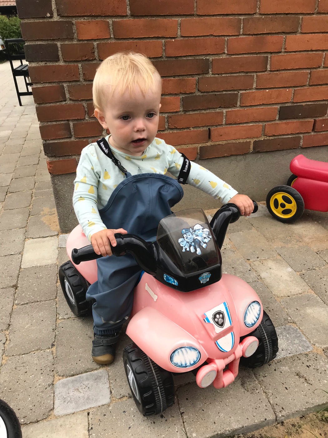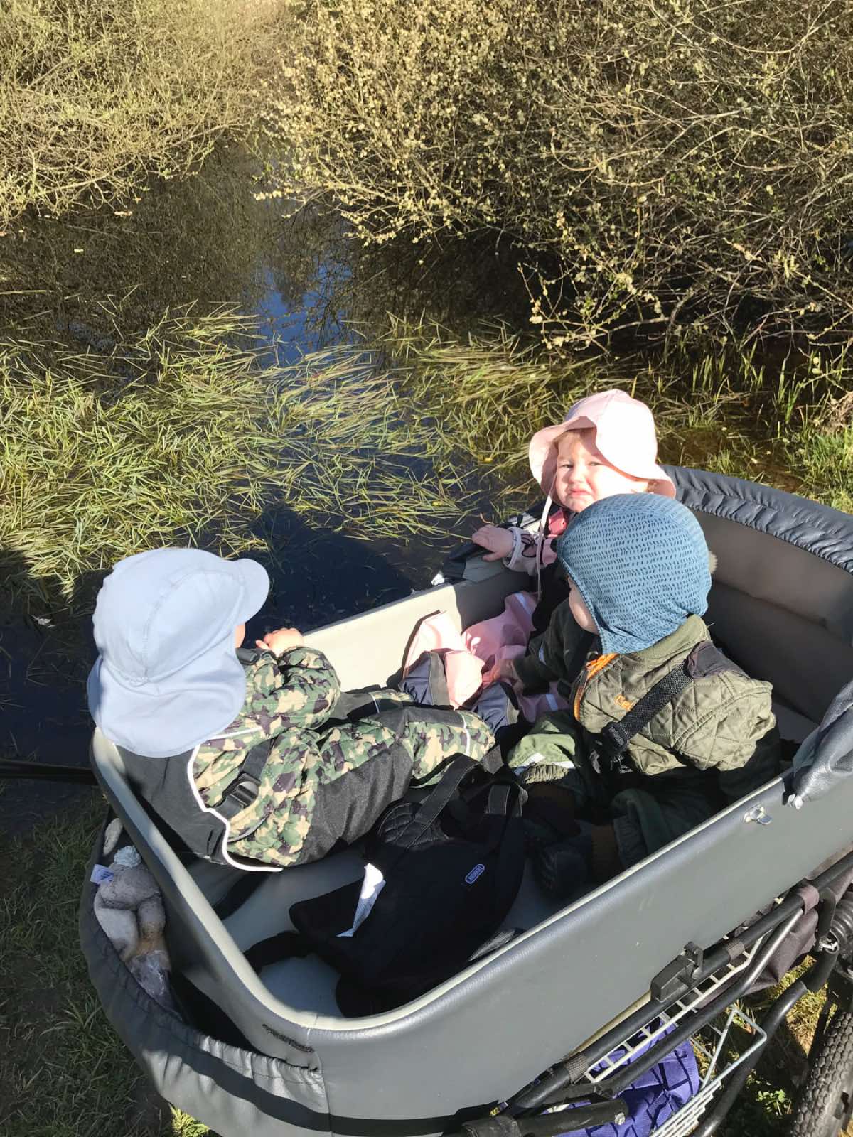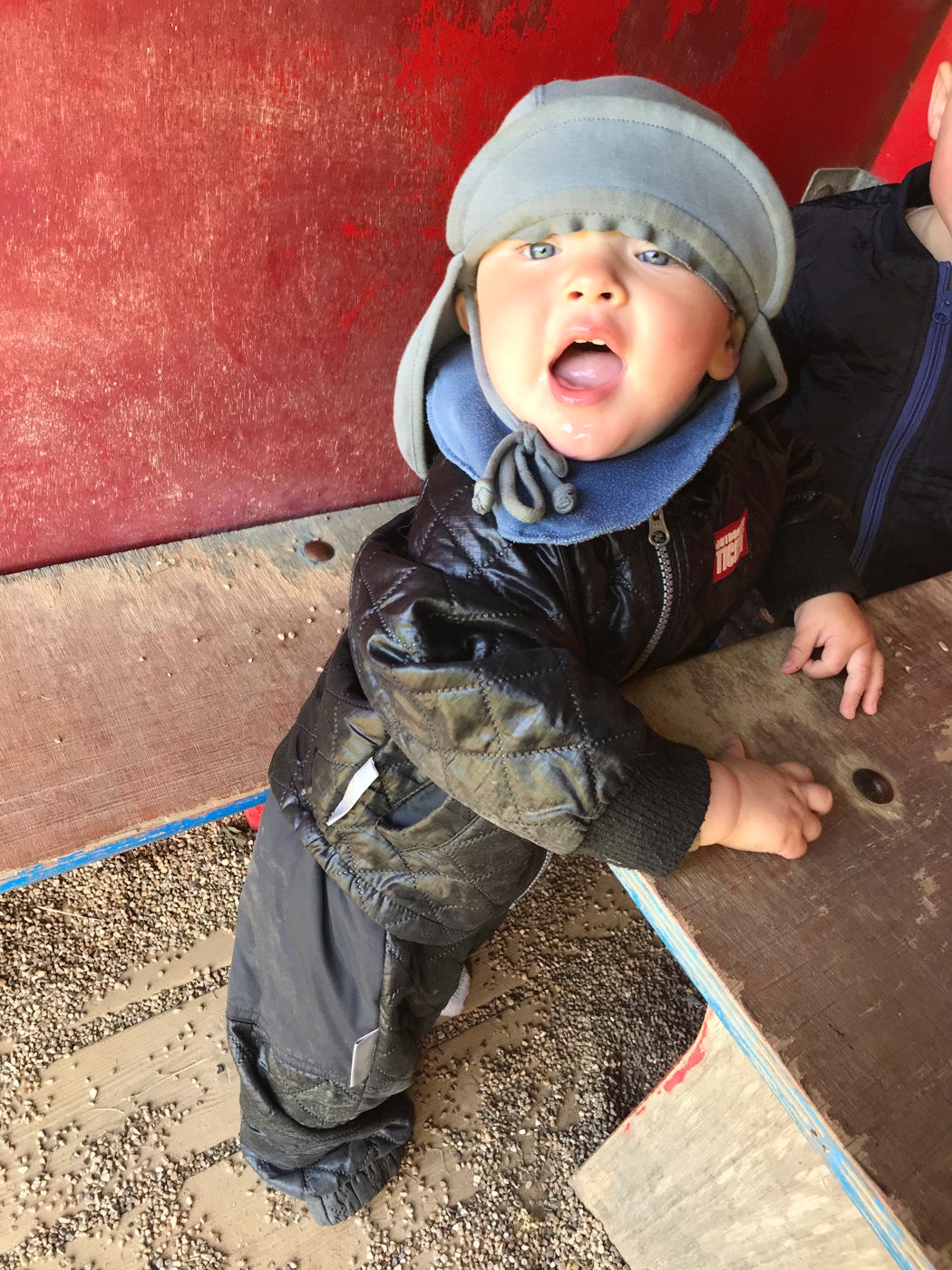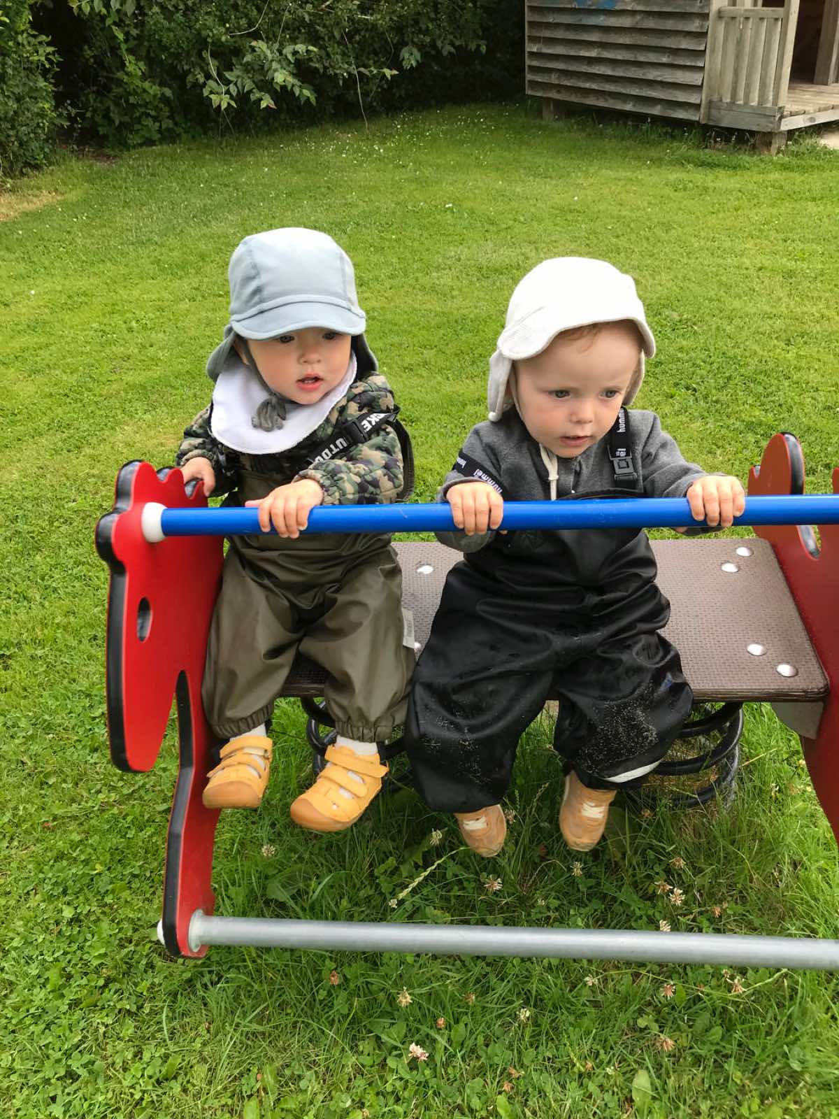 Vi er ofte på tur rundt i Hørning, fx på en legeplads, på udkig efter gravkøer, tog, dyr, eller hvad vi nu kan finde på.