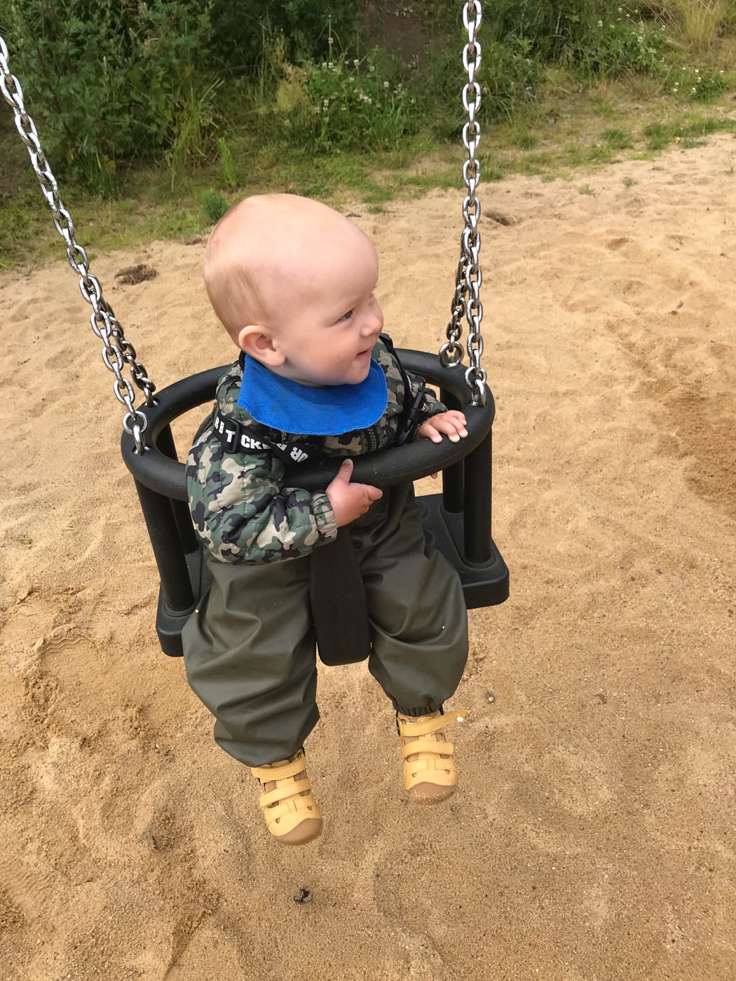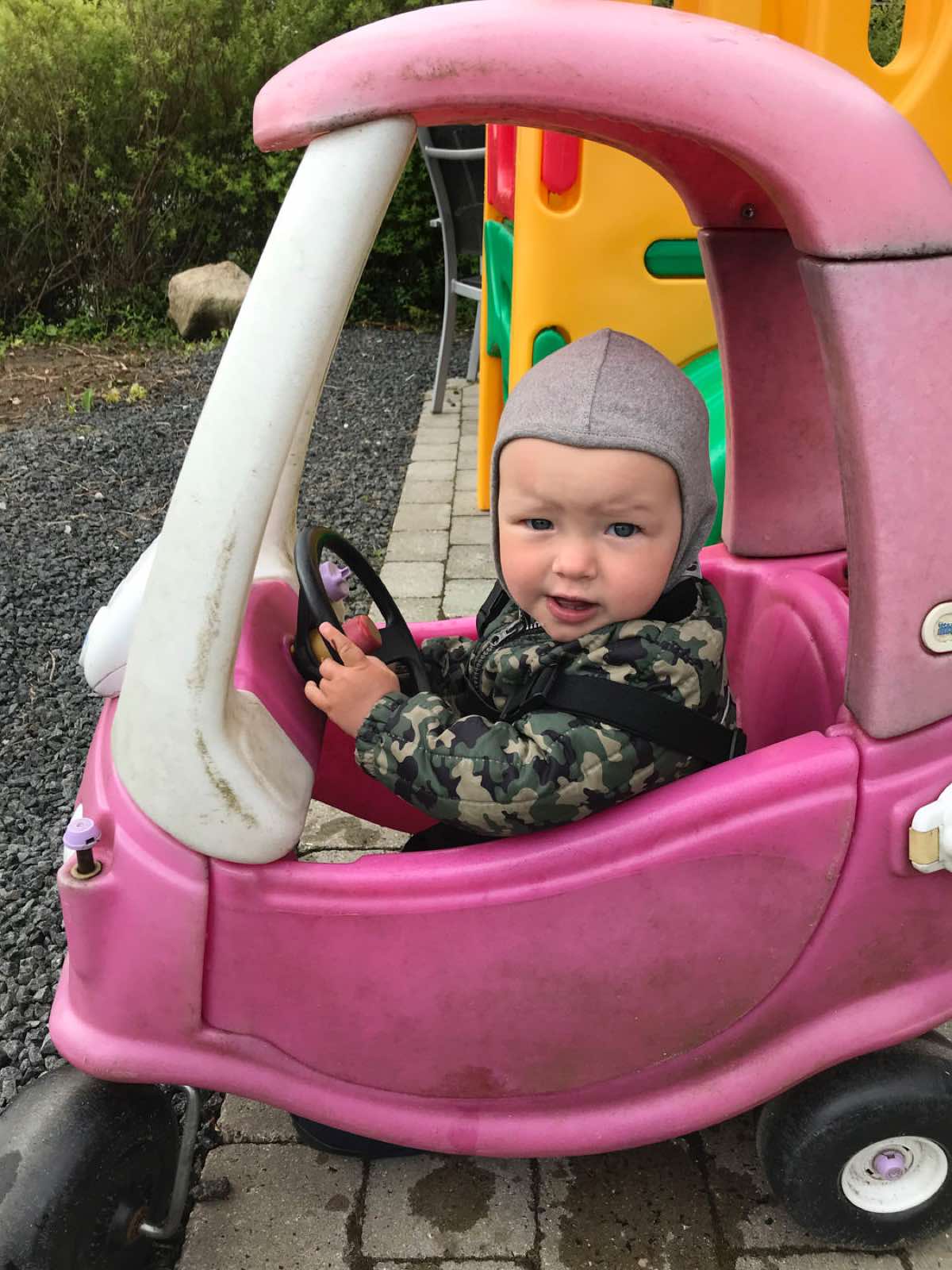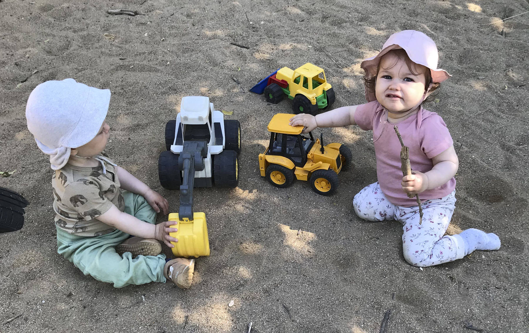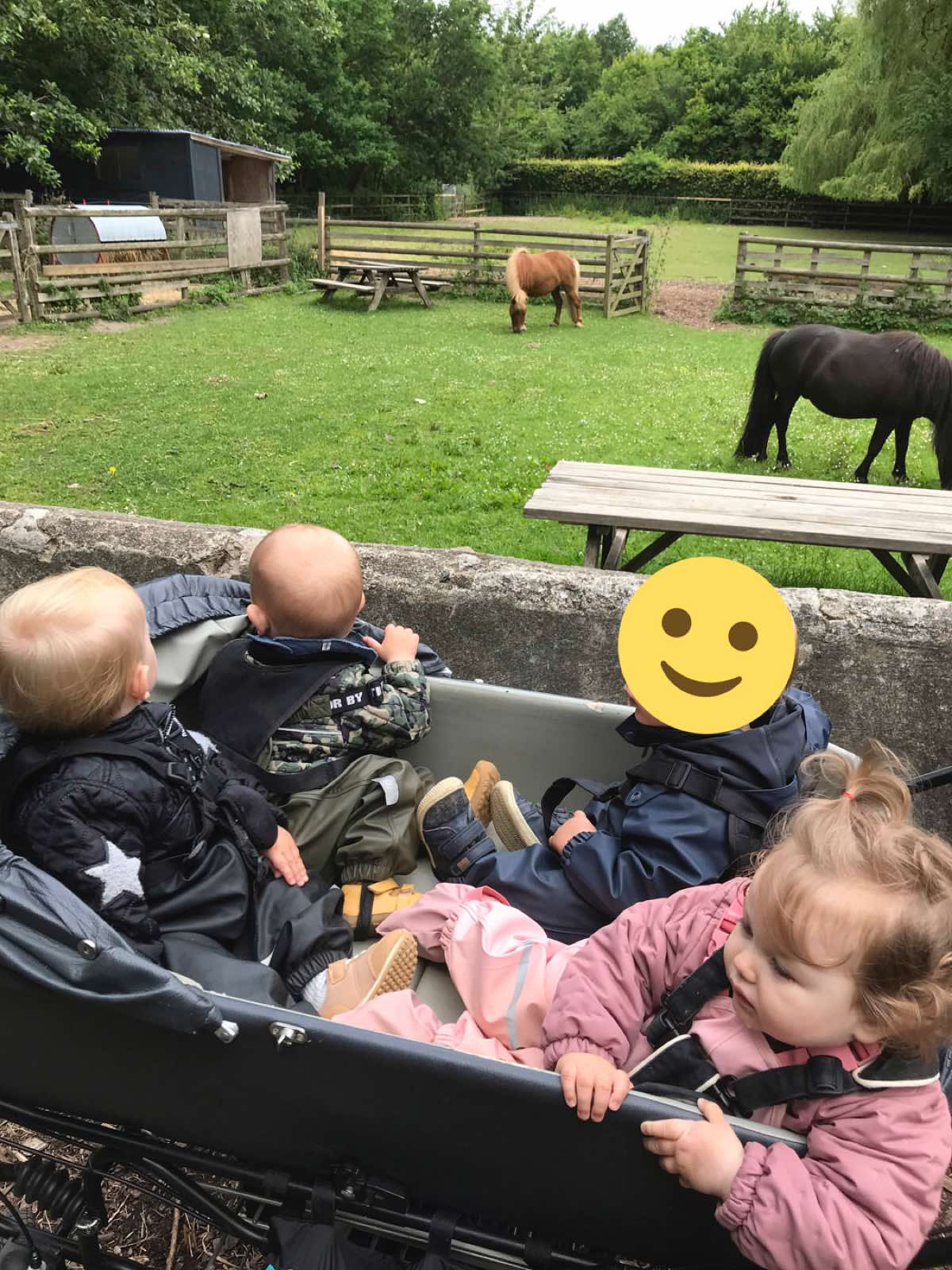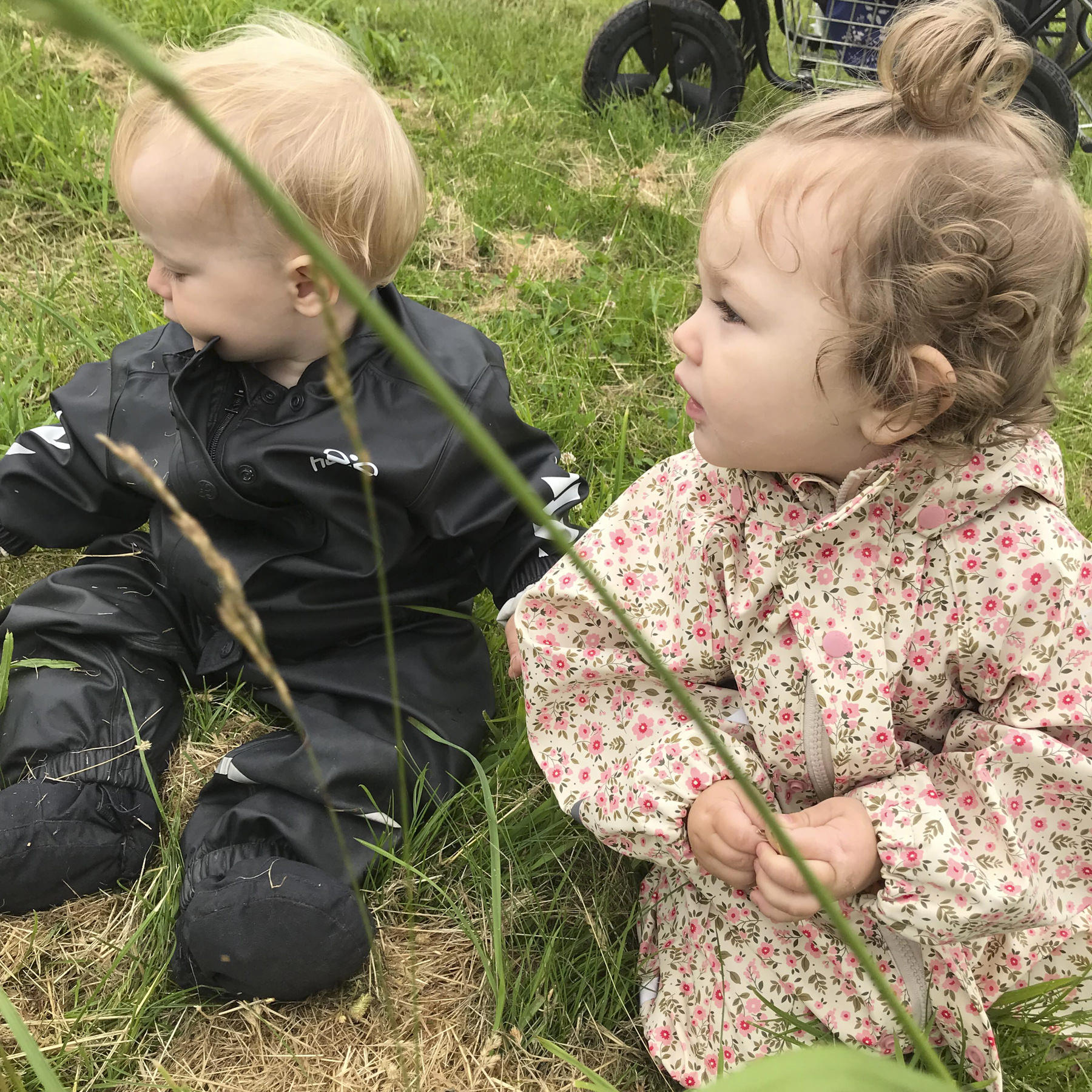 Vi er ofte på tur rundt i Hørning, fx på en legeplads, på udkig efter gravkøer, tog, dyr, eller hvad vi nu kan finde på.