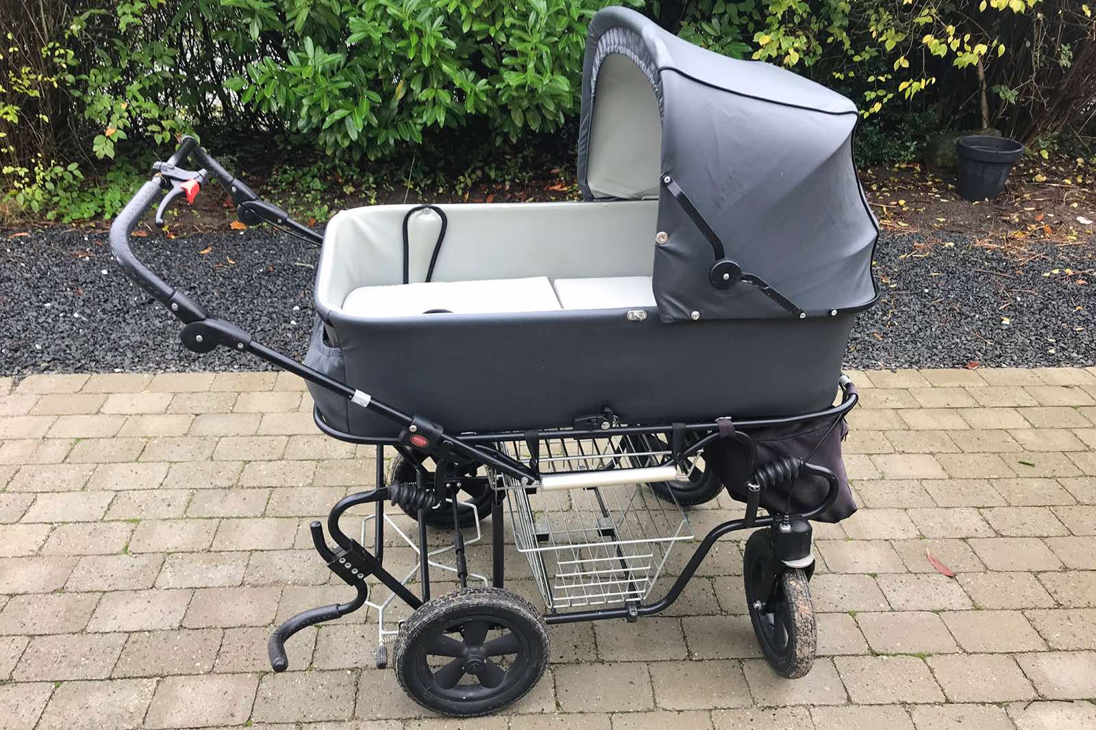 Barnevogn med sikkerhedsgodkendt sele, myggenet og regnslag.