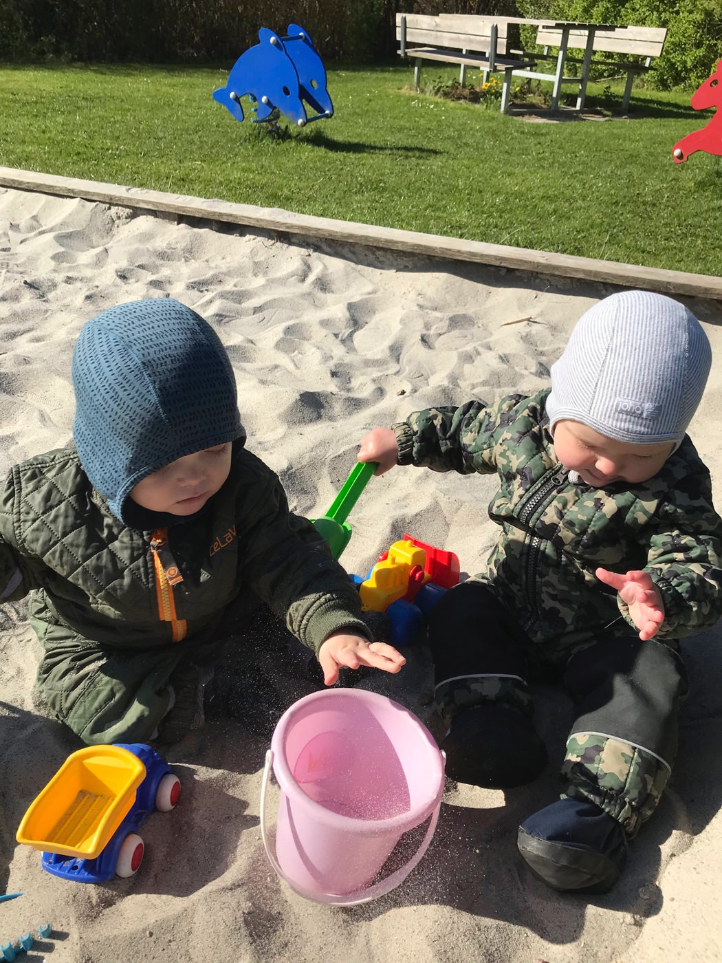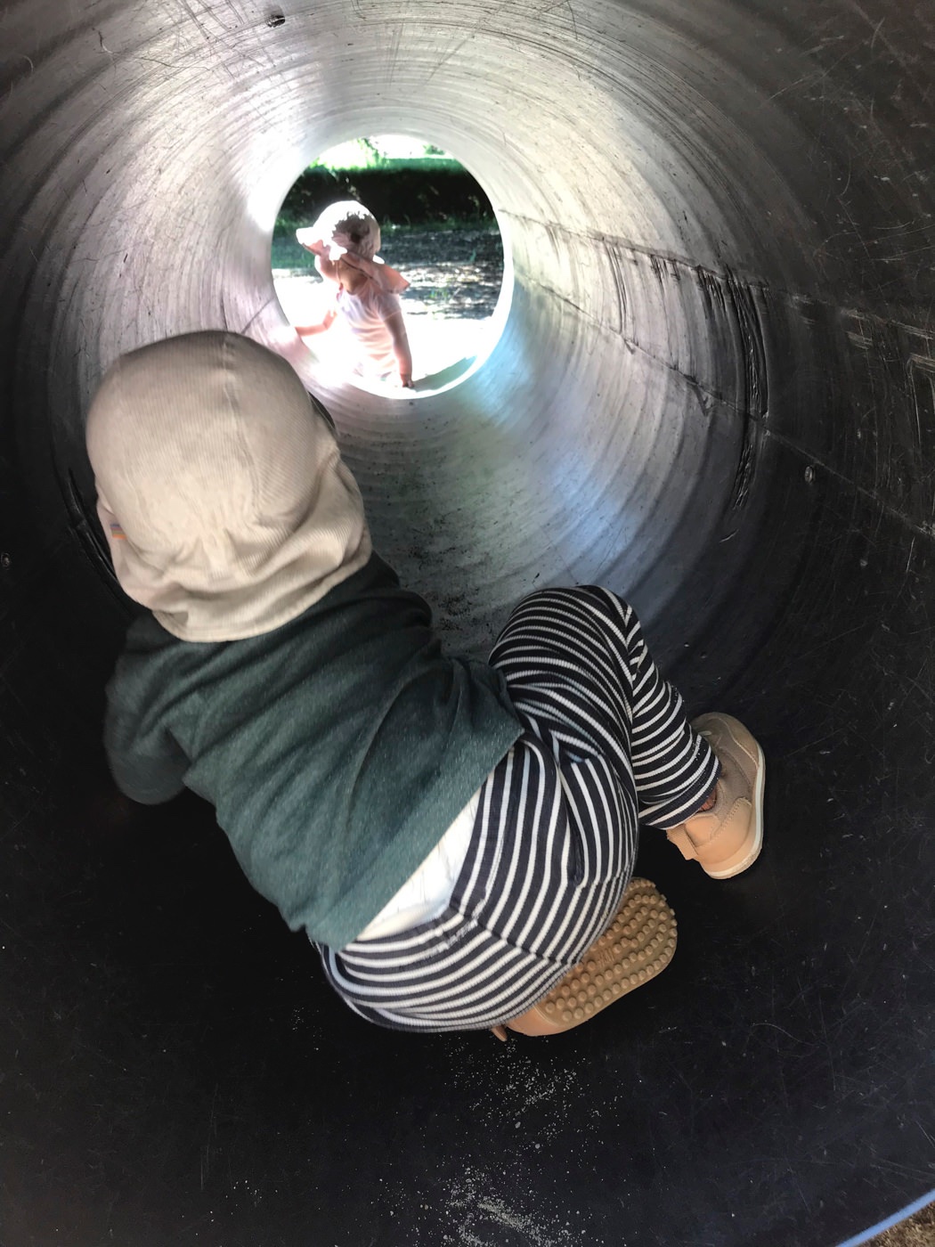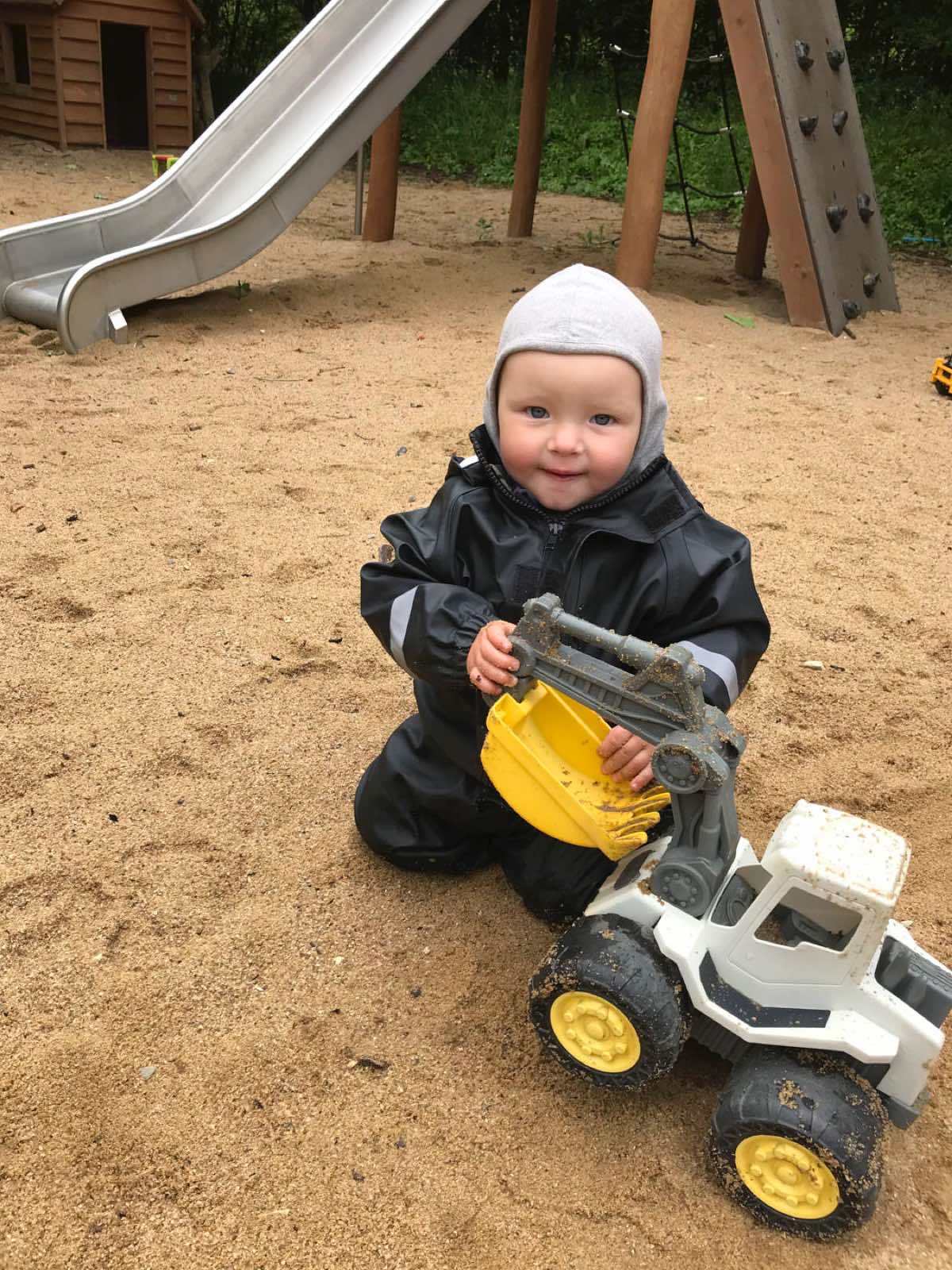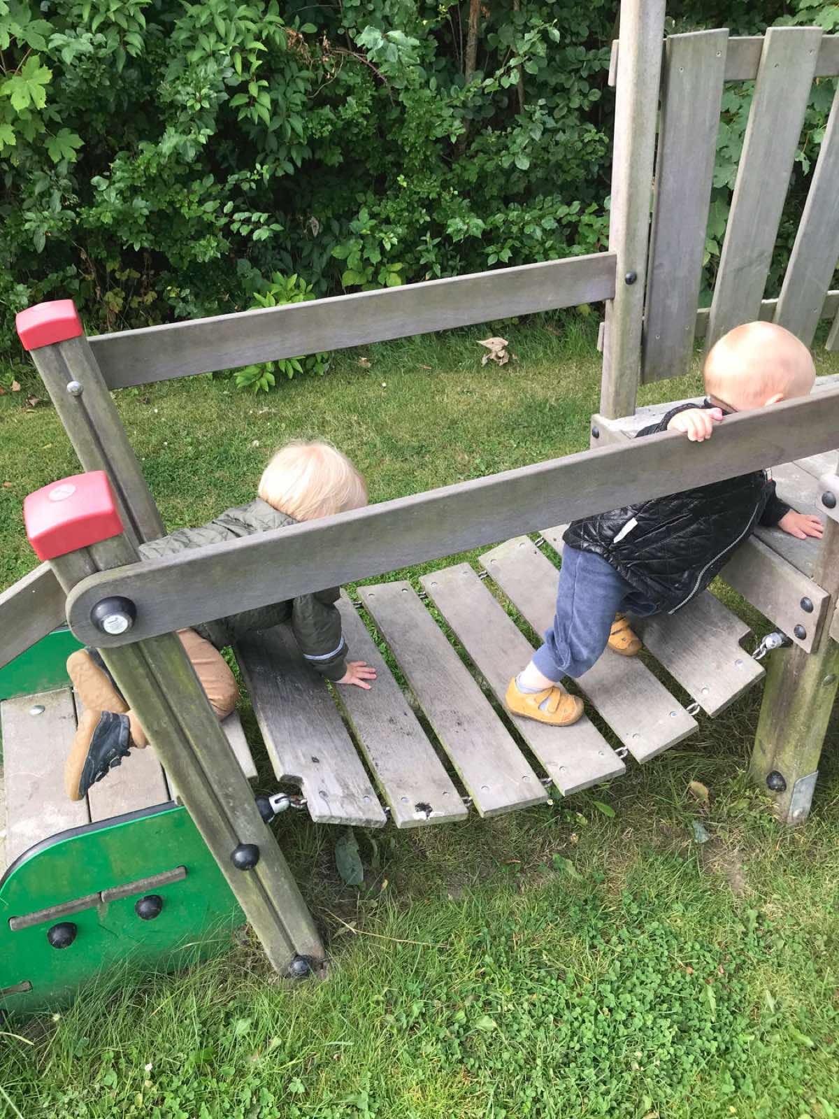 Vi er ofte på tur rundt i Hørning, fx på en legeplads, på udkig efter gravkøer, tog, dyr, eller hvad vi nu kan finde på.