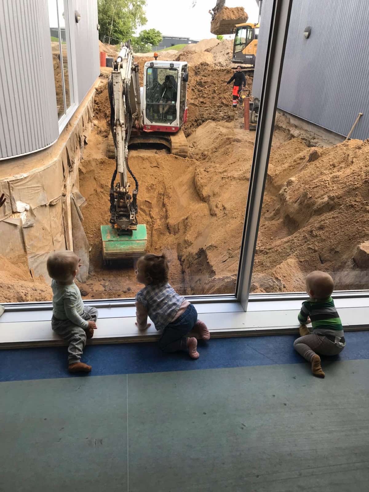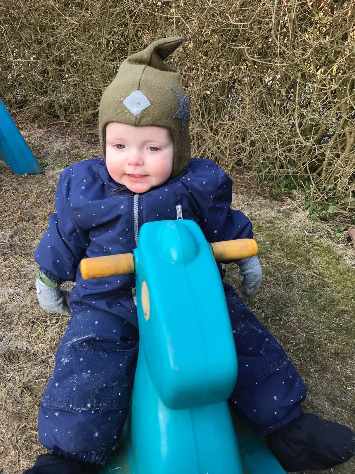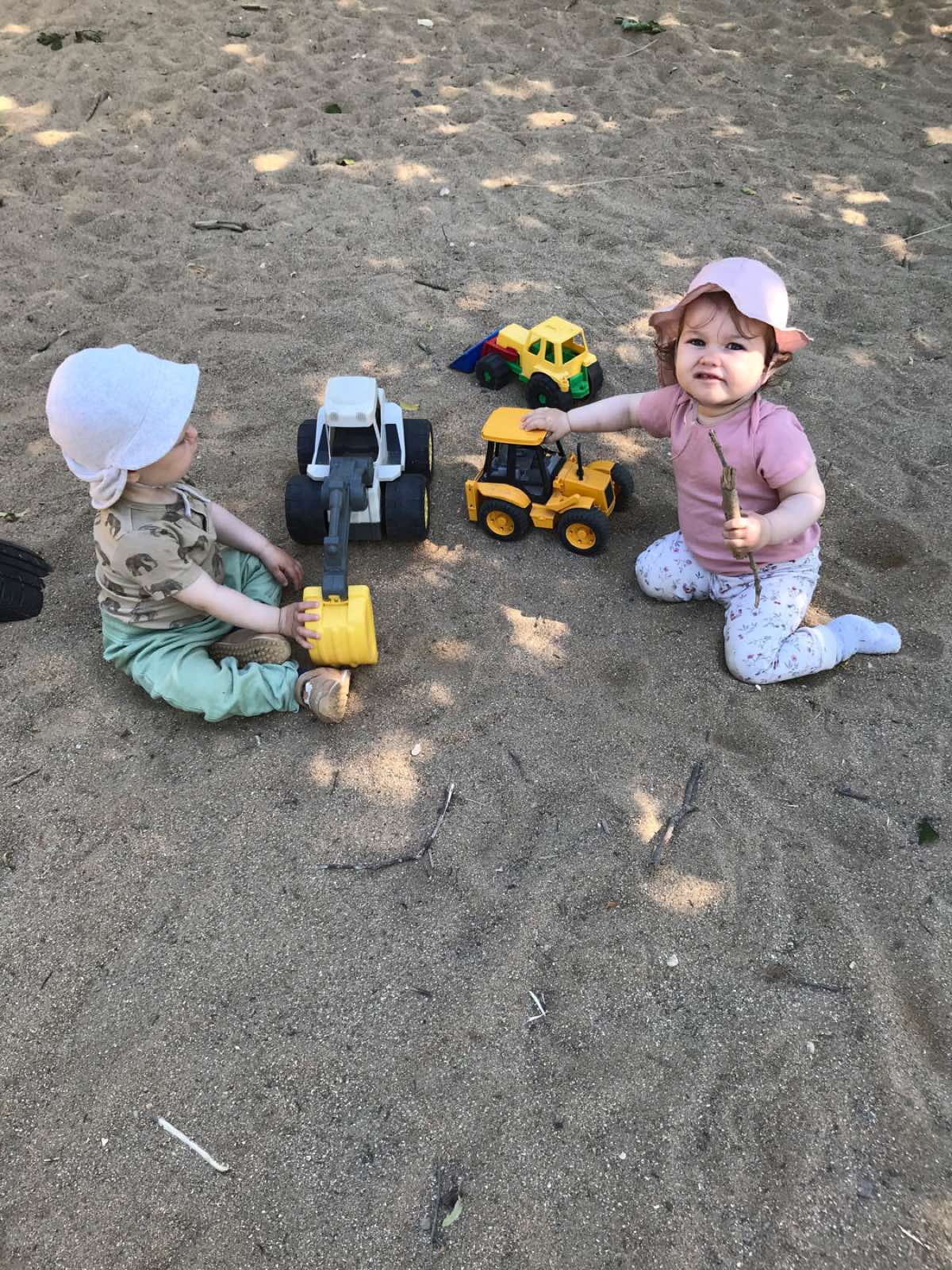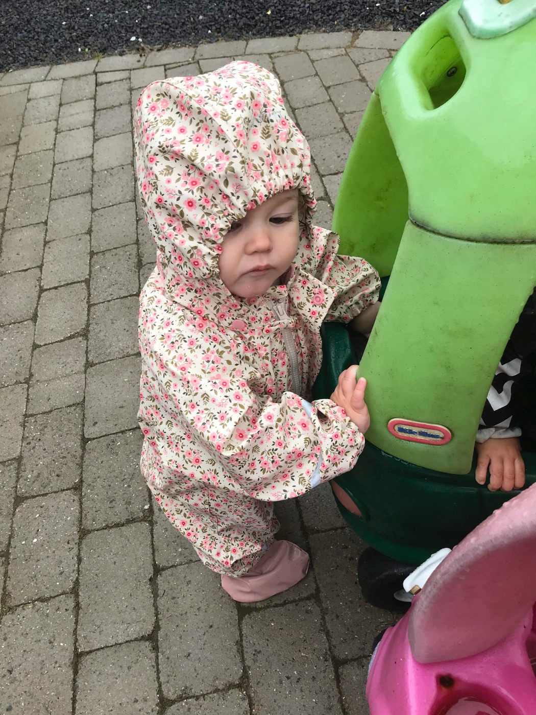 Vi er ofte på tur rundt i Hørning, fx på en legeplads, på udkig efter gravkøer, tog, dyr, eller hvad vi nu kan finde på.